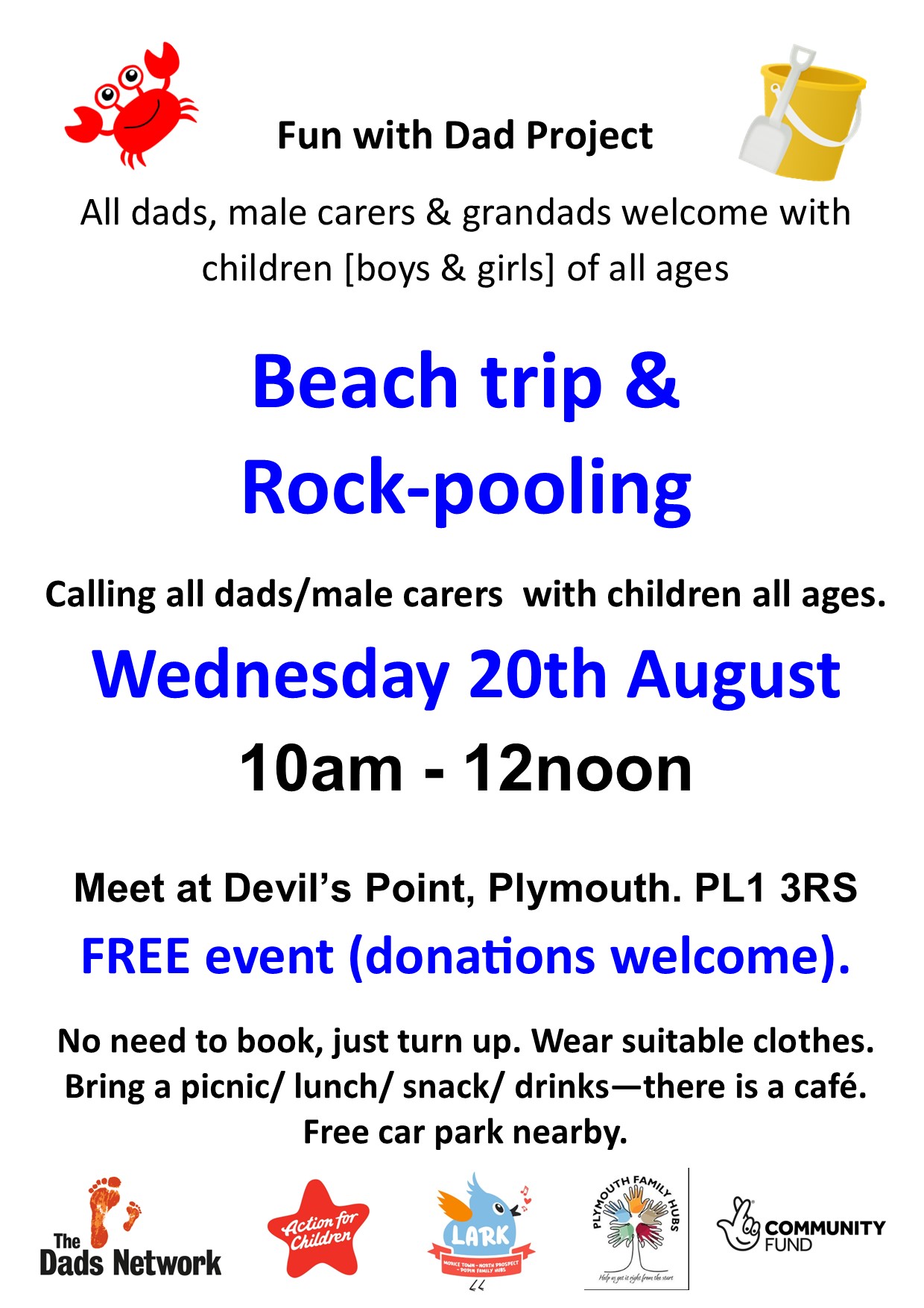Beach trip & Rock Pooling Free event (donations welcome)Mikaela BlowsJul 161 min readFun with Dad project. All dads, male carers and grandads welcome with children (boys and girls) of all ages. Follow this link to find out more.